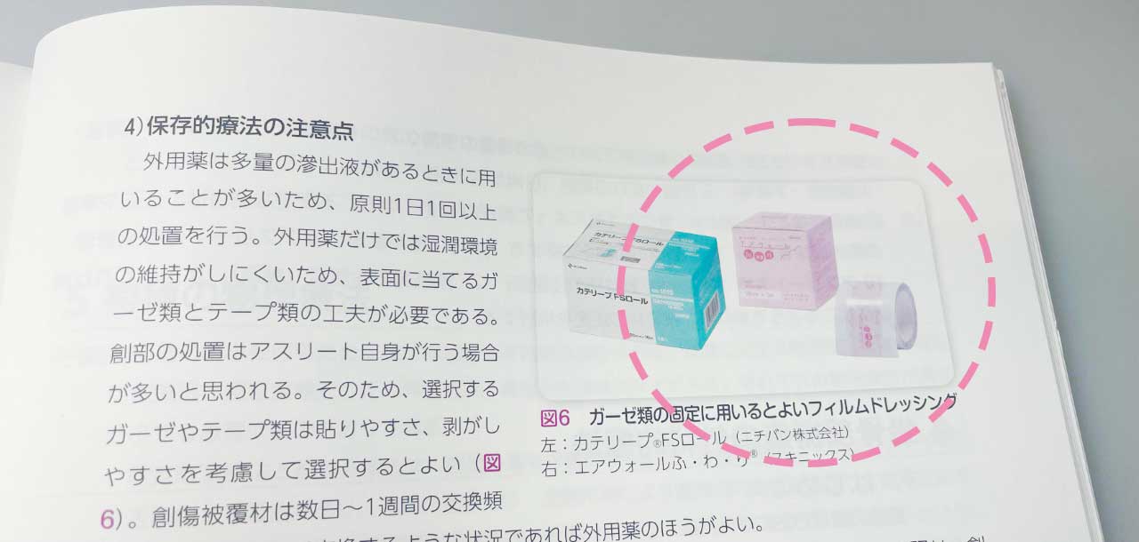 今回の記事では、車いすアスリートの褥瘡ケアに使用され、ガーゼ類の固定に用いるとよいフィルムドレッシングの一例として掲載されました。