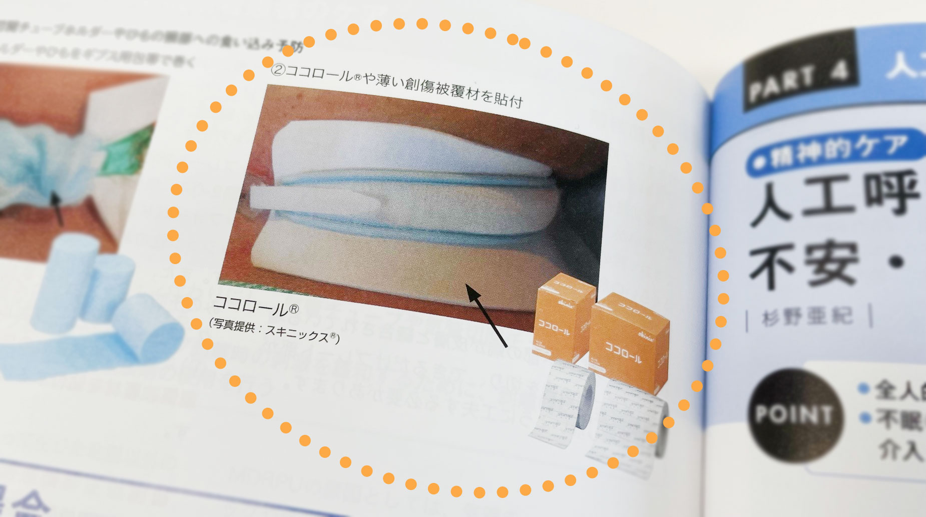 記事では、人工呼吸器患者に使用する気管切開チューブやひもの頸部への食い込み予防として、「接触部分の皮膚側にココロールや薄い創傷被覆材を貼付する」と紹介されました。