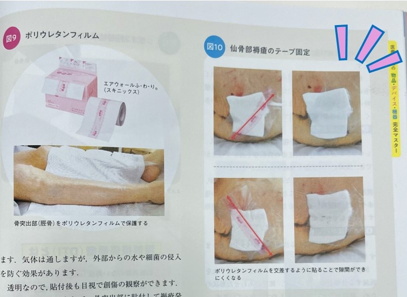 仙骨部の褥瘡予防や処置において、フィルムドレッシングを貼る際は、隙間ができると排泄物が入り込み、肌がかぶれてしまう原因となります。凹凸が激しい仙骨部でも、フィルムドレッシングを交差して貼ることによって、隙間ができにくくなり、褥瘡が起きている所や心配な箇所に便が触れず、かぶれの原因を防ぐことができます。記事には、褥瘡予防に役立つ固定方法が以下のように紹介されています。