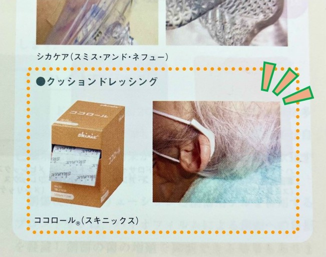 褥瘡・創傷関連のデバイスと処置法が記された記事中には、「エアウォールふ・わ・り」を使った仙骨部の褥瘡予防方法や「ココロール」を使ったマスク・弾性ストッキングの圧迫によるMDRPU予防について紹介されています。