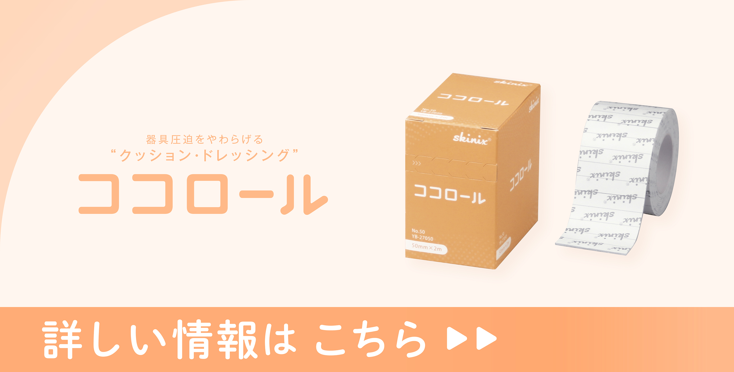 クッションドレッシングの代表例として紹介された「ココロール」は、器具のこすれや圧迫等を吸収し、肌が脆弱な方へのガーゼや器具のズレなどのフィッティング調整に使用されるクッションドレッシングです。詳しくは製品ページをご覧ください。