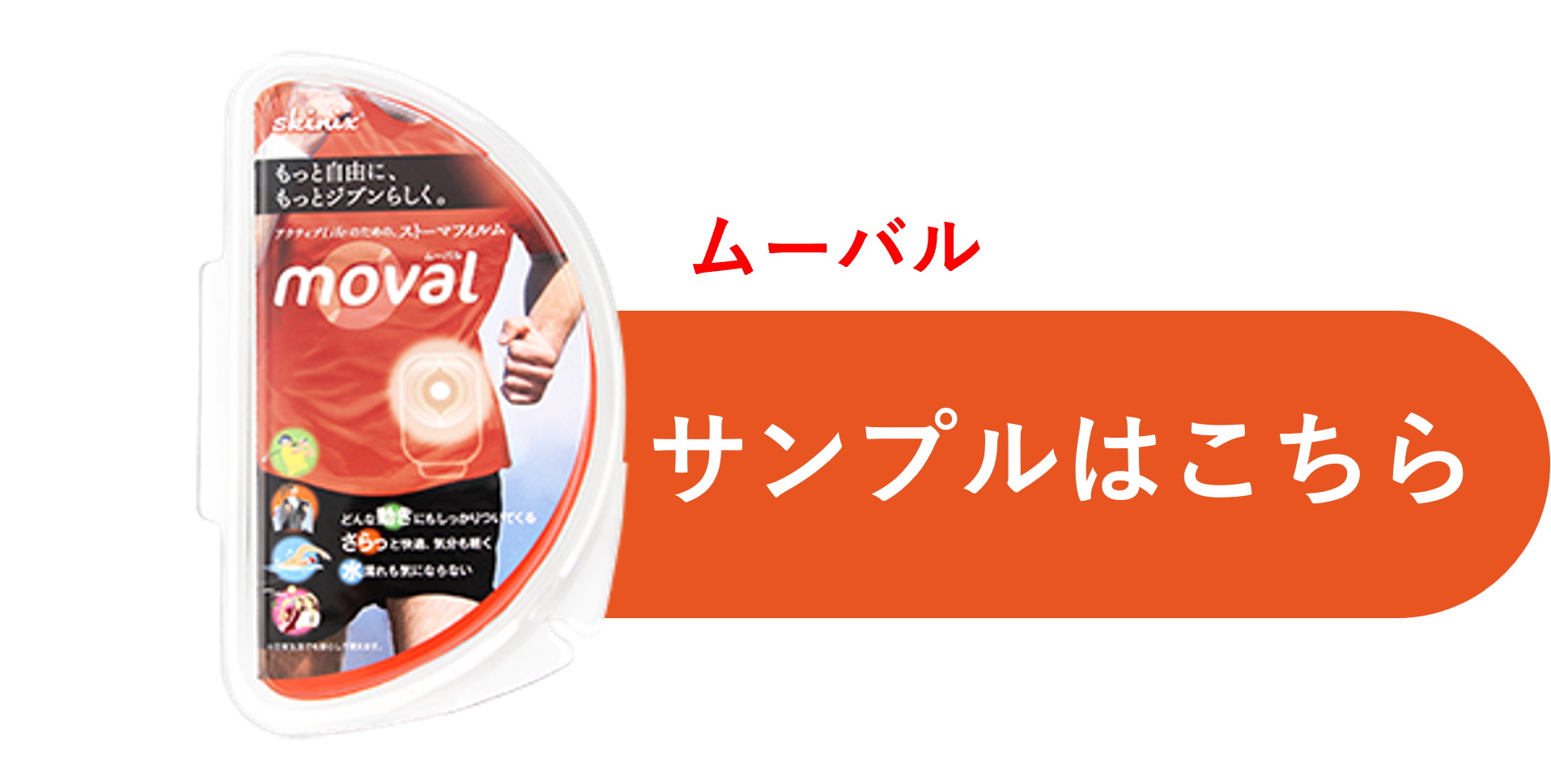 ムーバルは極薄で柔軟な防水フィルムです。この極薄フィルムが肌の凹凸に沿ってぴったりと密着するため、漏れの不安を解消します。また、ムーバルのフィルムは、伸縮性と透湿性の高いフィルムを使用しています。そのため、体の様々な動きにしなやかにフィットし、汗を素早く蒸発させムレにくいので、体を動かす仕事やスポーツの際にもはがれにくく、汗をかいてもさらっと快適な状態を保ちます。特にムーバルは、 ストーマの漏れが心配な方、スポーツをされている方に安心してお使いいただけます。
