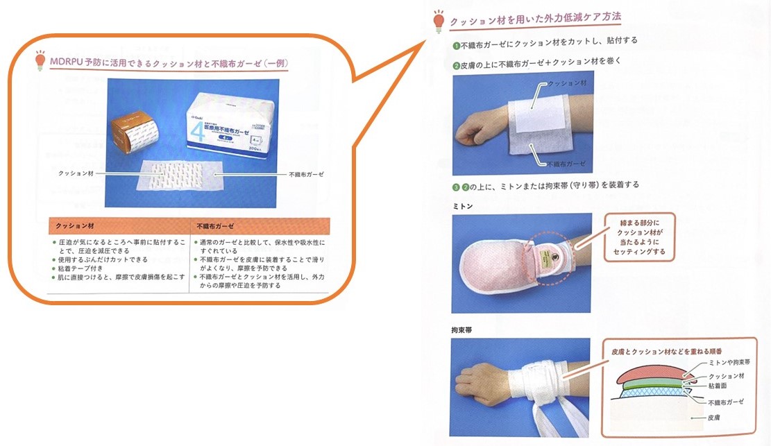 また書籍には、ミトンや拘束帯によるMDRPU対策において、クッション材による外力低減ケアを行うことや、皮膚が脆弱な方には、皮膚の保湿を行うことが必要だと記載されています。