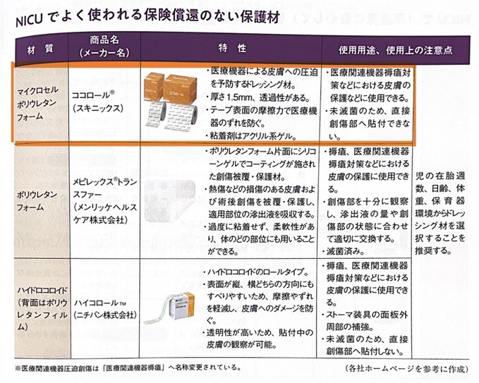 書籍には、「ココロール」がNICUでよく使われる保護材として、「テープ表面の摩擦力で医療機器のずれを防ぐ」ことや、「医療機器関連褥瘡対策などにおける皮膚の保護に使用できる」という製品の特性や使用用途が掲載されています。
