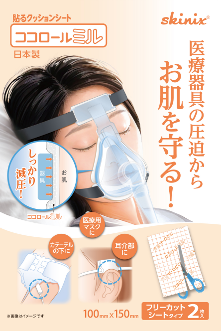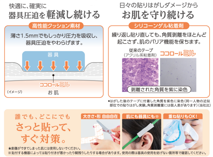 器具圧迫を和らげるクッション素材と角質剥離が少ないゲル粘着剤で、さっと貼るだけのMDRPU対策を在宅の現場にもお届けします。