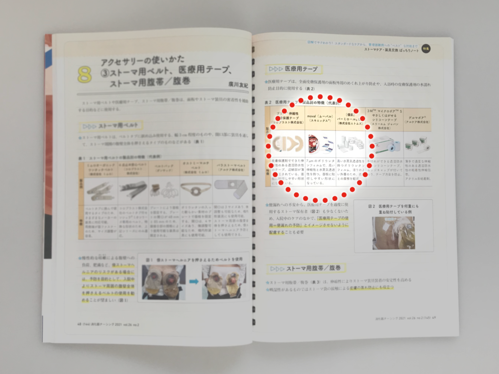 今号のメイン特集「ストーマケア・装具交換ばっちりノート」の記事中で、面板外周のめくれ上がり防止や、入浴時の皮膚保護剤の水濡れ防止に役立つ医療用テープの代表例としてmovalが紹介されています。