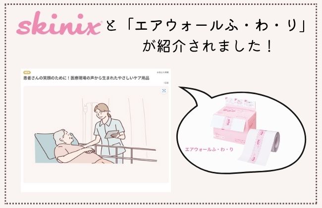 NEWSアイコン NEWS ALL ALL skinixについて製品について学会・展示会メディア掲載その他 ------- ALL skinixについて製品について学会・展示会メディア掲載その他 2025 2025202420232022202120202019 ------- 2025202420232022202120202019 【動画公開】尿道カテーテル・ドレーン固定テープ「クリアホールドライナー」の特長を紹介! 2025.12.09 製品について 「学術レポート」2本追加!【身体的拘束最小化】【MDRPU対策】 2025.10.24 skinixについて WOCナースとともに、現場の「困った」を解決するために。尿道カテーテル・ドレーン固定テープ「クリアホールドライナー」の開発ストーリーを公開 2025.10.15 製品について 在宅でのMDRPU対策に。「ココロールミル」のシートタイプが新登場 。 2025.09.18 製品について 【新製品情報】尿道カテーテル・ドレーン固定テープ「クリアホールドライナー」新登場! 2025.09.01 製品について WOCナース監修のスキン-テア対策書籍にskinix製品が紹介されました! 2025.07.23 メディア掲載 入浴や褥瘡対策に!訪問看護師におすすめの「エアウォールふ・わ・り」が在宅ケア書籍で紹介! 2025.06.19 メディア掲載 医療・福祉向けの情報サイト「mikaru」にskinixとエアウォールふ・わ・りが紹介されました。 2025.06.16 メディア掲載 手術中のMDRPUや褥瘡の対策製品として、オペナース向け専門誌にskinix製品が紹介されました! 2025.06.09 メディア掲載 【在宅看護でのMDRPU対策】セミナー動画無料公開(MDRPU好発機器での対策) 2025.02.26 その他 ナノテアフィット廃番のお知らせ 2025.02.15 製品について 【在宅看護での褥瘡対策】セミナー動画無料公開(かかと・仙骨のフィルム材の貼り方) 2025.01.10 その他 12