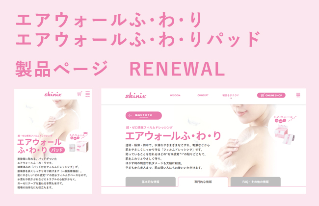NEWSアイコン NEWS 製品について ALL skinixについて学会・展示会メディア掲載製品についてその他 ------- ALL skinixについて学会・展示会メディア掲載製品についてその他 2020 2025202420232022202120202019 ------- 2025202420232022202120202019 「エアウォールふ・わ・り」「エアウォールふ・わ・りパッド」製品ページをわかりやすくリニューアル! 2020.12.16 製品について オンラインショップのご案内 2020.11.24 製品について 「ココロール カテ用」製品ページを公開! 2020.07.06 製品について 97%UVブロックフィルム・エアウォールUVに「19mm幅タイプ」が新登場! 2020.04.30 製品について 「moval」一般の方向けページを公開 2020.04.15 製品について 傷あとケア専用テープ・アトレスケアのパッケージが、リニューアル! 2020.03.16 製品について 新製品「ココロール・カテ用」登場! 2020.02.14 製品について 新製品「moval(ムーバル)」登場! 2020.02.07 製品について 傷あとケア専用テープ・アトレスケアに「Mサイズ・30枚入り」が新登場! 2020.02.03 製品について 使い方・工夫を更新!「フィルムドレッシングの用途10パターン」ほか6件 2019.12.24 skinixについて製品について 「ココロール」製品ページを、一般の人にもわかりやすくリニューアル!|製品ページ更新のご案内 2019.12.17 製品について 123