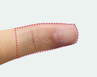 このようにフィルムドレッシングをカットして貼ることによって、フィルムが指先の形状に沿ってシワなく密着し、水の侵入をしっかりガード。