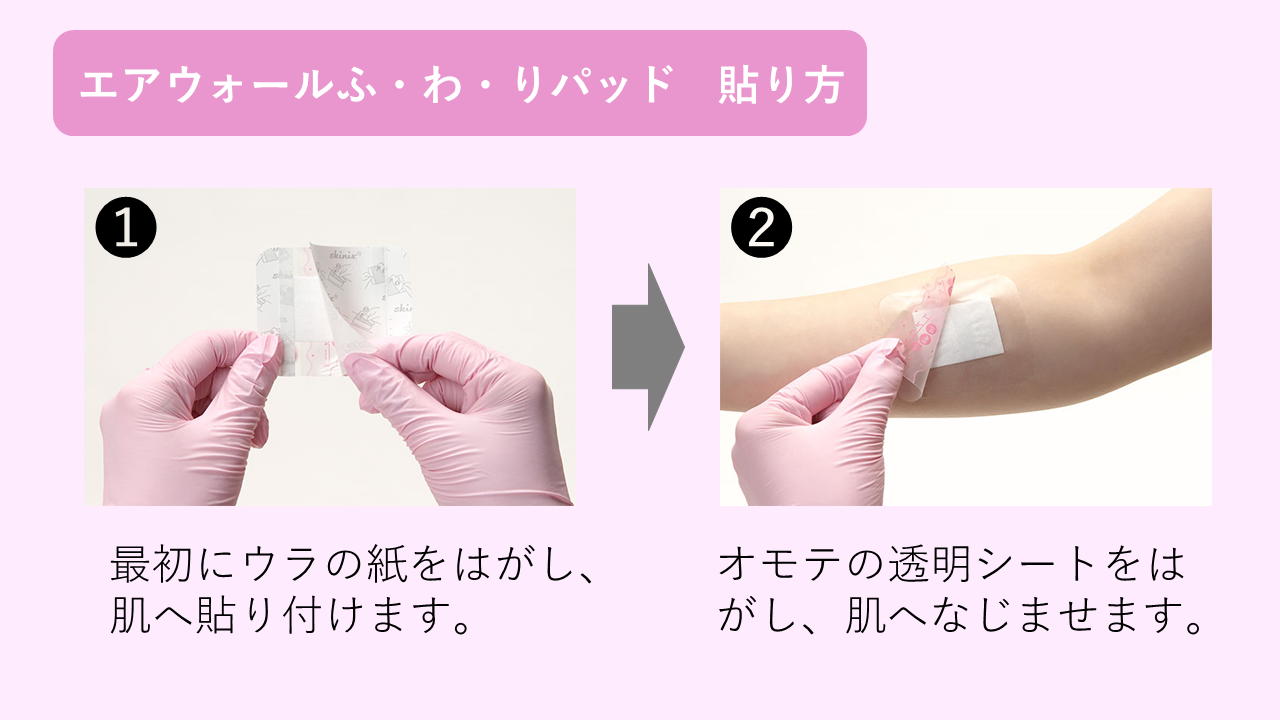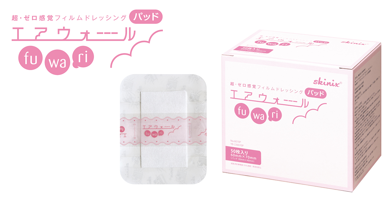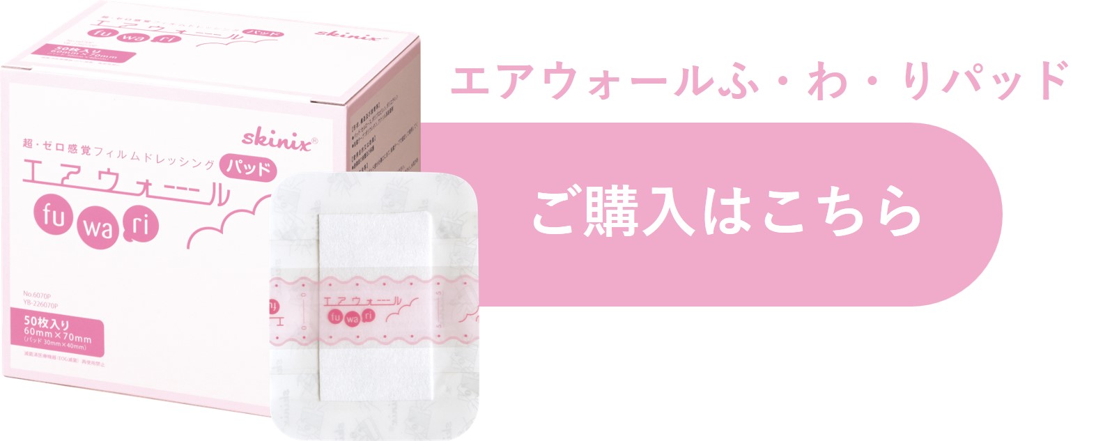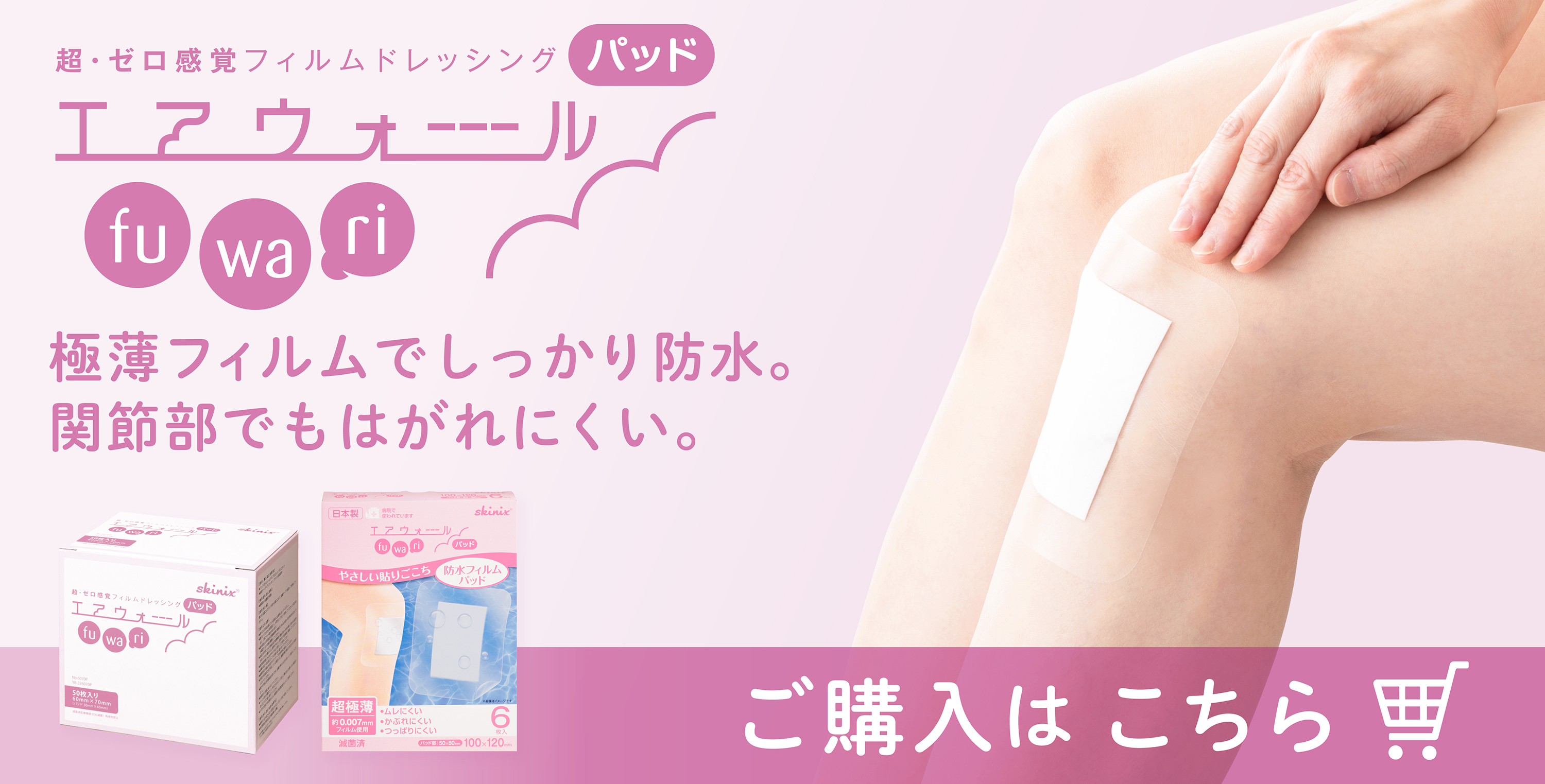 直接傷に貼れる、滅菌済みのパッド付きフィルムドレッシング「エアウォールふ・わ・りパッド」製品ページはこちら