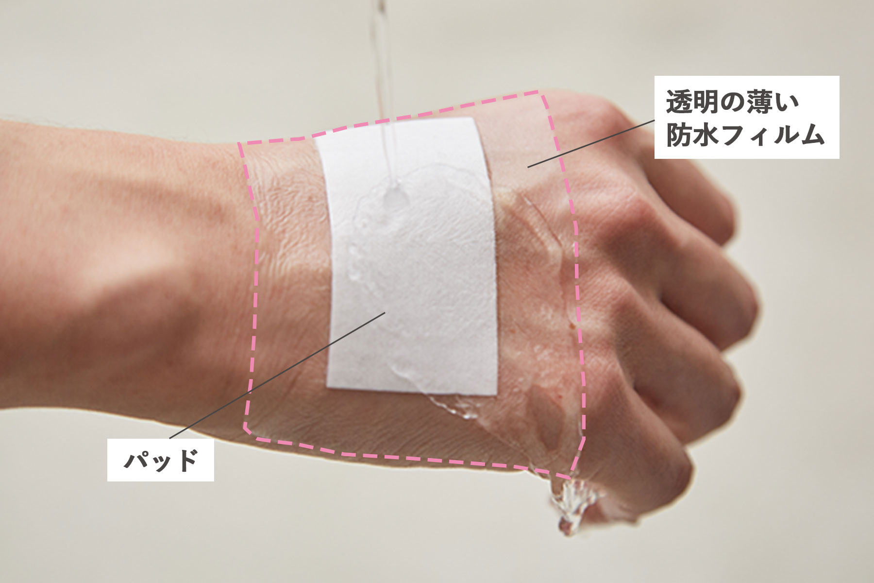 ご家庭で使用されている一般的な絆創膏だと、大きいサイズのものがなかったり、シャワーの際にすぐはがれてきたりしませんか。そんな時に医療施設で使用されているのは、透明の薄い防水フィルムにパッドが付いたタイプの大型絆創膏です。