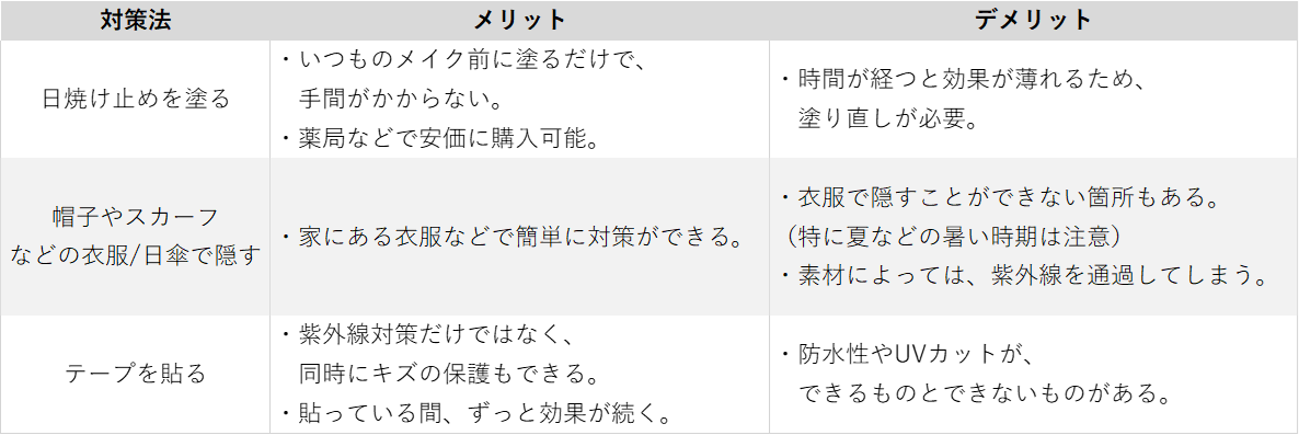紫外線対策には、一般的な日焼け止めクリームを塗る方法以外にも、衣服で隠したり、紫外線カット機能のあるテープを貼るなど様々なものがあります。以下ではいくつかの紫外線対策方法と、メリット・デメリットを紹介します。