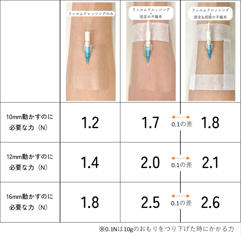 3パターン(フィルムドレッシングのみ・フィルムドレッシング+固定の不織布・フィルムドレッシング+固定&周囲の不織布)の固定をして、それぞれ一定の力でカテーテルを腕と平行方向に引っ張ります。カテーテルを10mm、12mm、16mm動かすのに必要な力の強さを測り、固定力の強さを検証します。