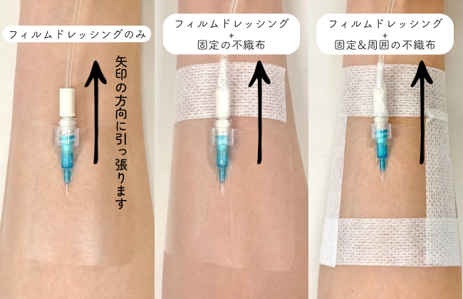 結果として、フィルムドレッシングのみの固定方法の場合は固定力が弱めでした。