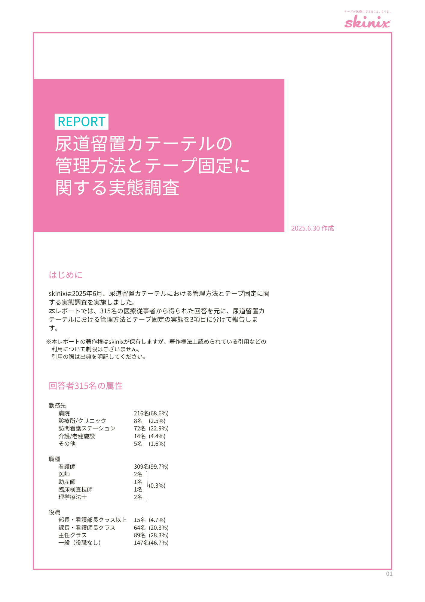 skinixは2025年6月、尿道留置カテーテルにおける管理方法とテープ固定に関する実態調査を実施し、315名の医療従事者から回答を得た内容を調査レポートにまとめました。