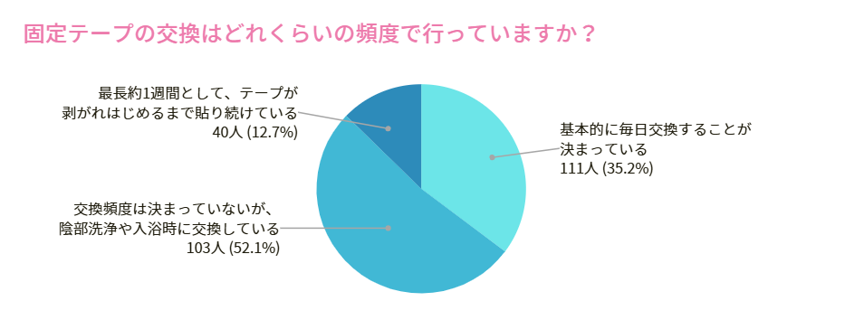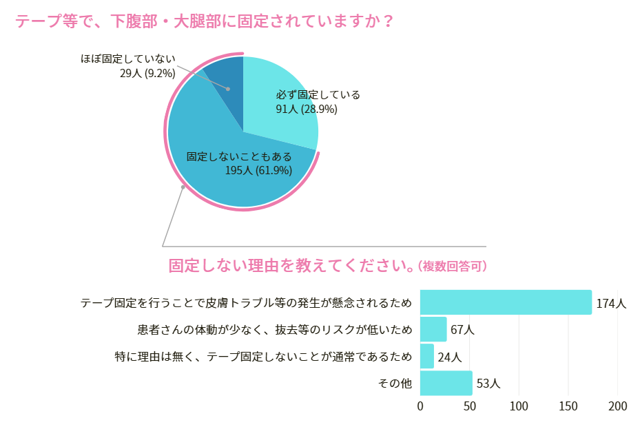 特に、テープ固定による皮膚トラブルへの懸念から、固定を避ける傾向が見られ、今後は皮膚への影響を抑える工夫や製品のニーズが高まっていることが示唆されます。