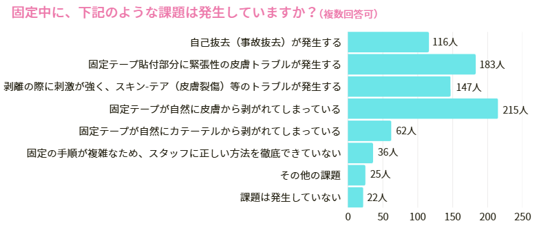 また、「⾃⼰抜去(事故抜去)が発⽣する」や、「固定テープが⾃然にカテーテルから剥がれてしまっている」という声もありました。