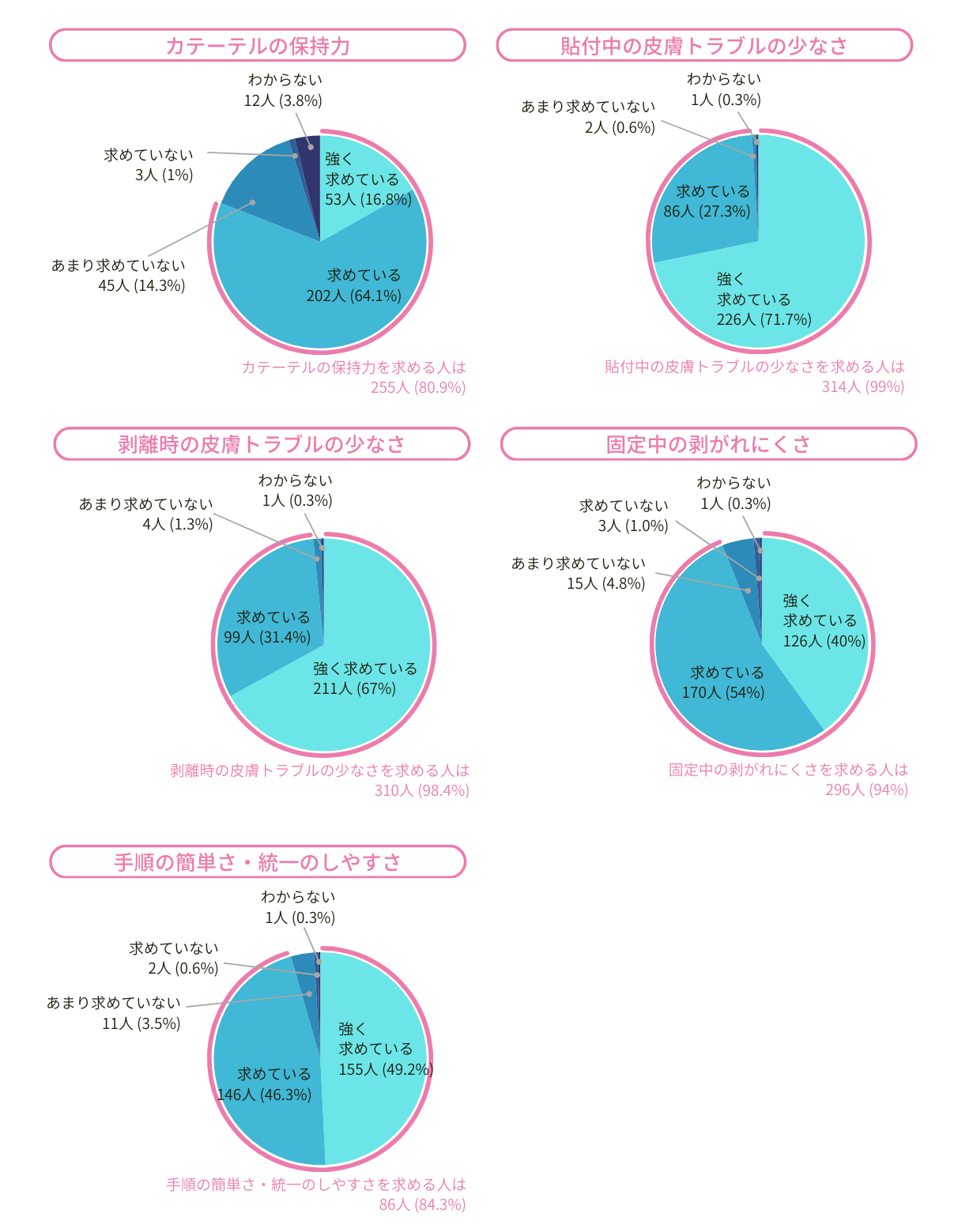 尿道留置カテーテル固定用のテープに対して最も求めることは「皮膚トラブルを起こさないこと」であり、貼付中の皮膚トラブルの少なさを求める人が99%、剥離時の皮膚トラブルの少なさを求める人は98%にのぼりました。それに続いて求められている要素は、上位から順に「固定中に剥がれにくいこと」「手順が簡単で統一しやすいこと」「カテーテルをしっかり保持できること」でした。