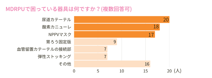 また、尿道カテーテルの場合にはカテーテルによる圧迫がMDRPUになるという意見が多く、オメガ固定するなどの工夫が簡単にできることが求められていることが分かります。