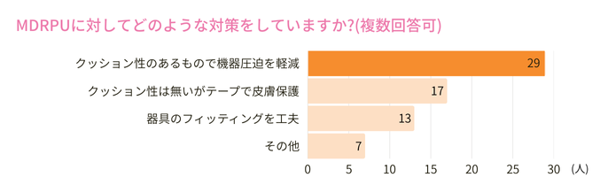 MDRPUの対策として、多くの人がガーゼや創傷被覆材などのクッション性のあるものを用いて機器の圧迫を軽減していることが分かりました。