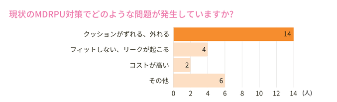 MDRPU対策の上で起こる問題としては、ガーゼなどがずれてしまって効果を発揮しないというケースが最も多く見られました。また、NPPVマスクなどにおいては、クッション材を挟んだ結果段差ができてリークが起きてしまう、クッション材として創傷被覆材を使おうとするとコストが高いという意見もありました。