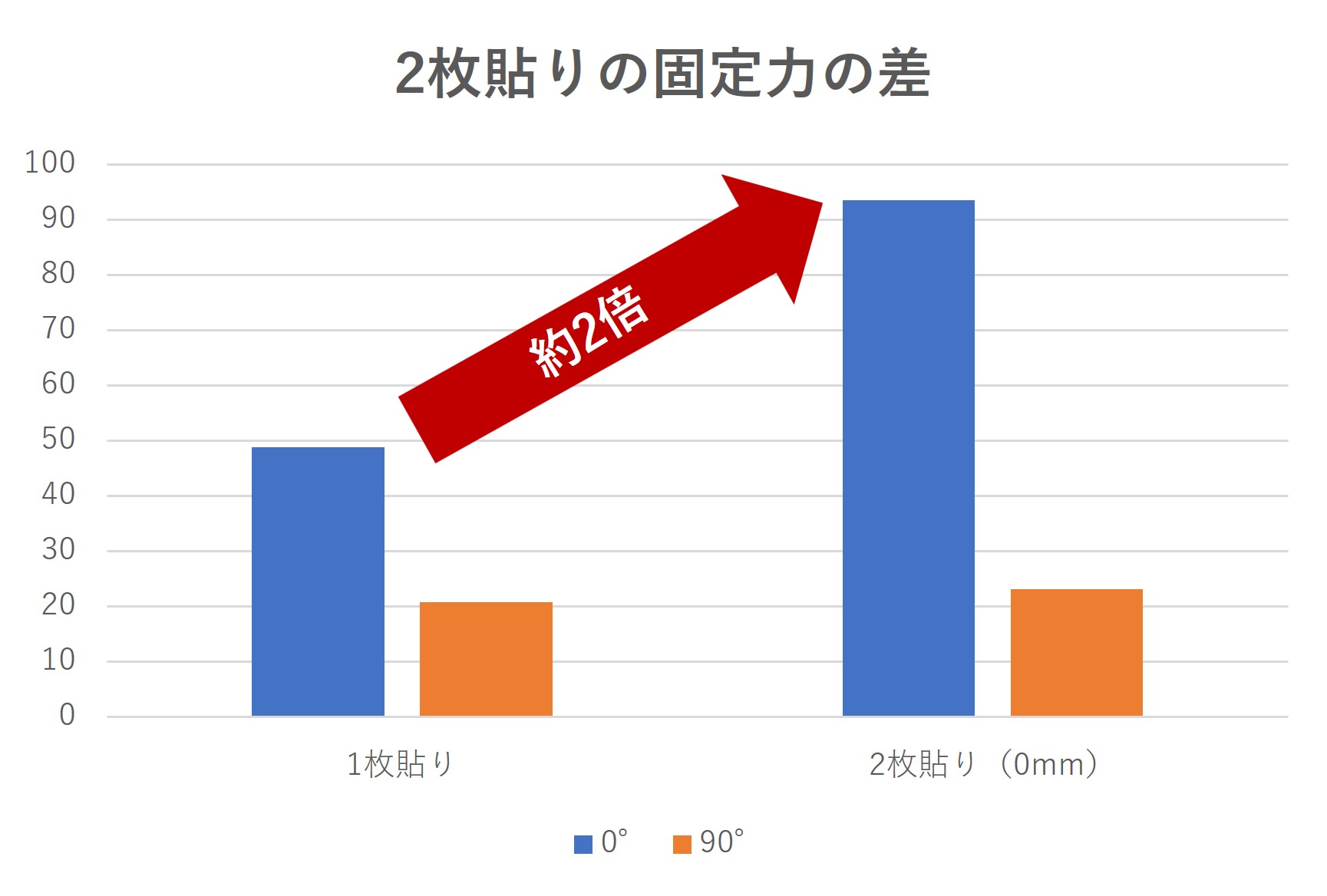 実際に、1枚貼りと2枚貼りの「0mm」を比較すると、平行(0°)方向に引っ張った場合は、固定力が約2倍に向上する結果となりました。