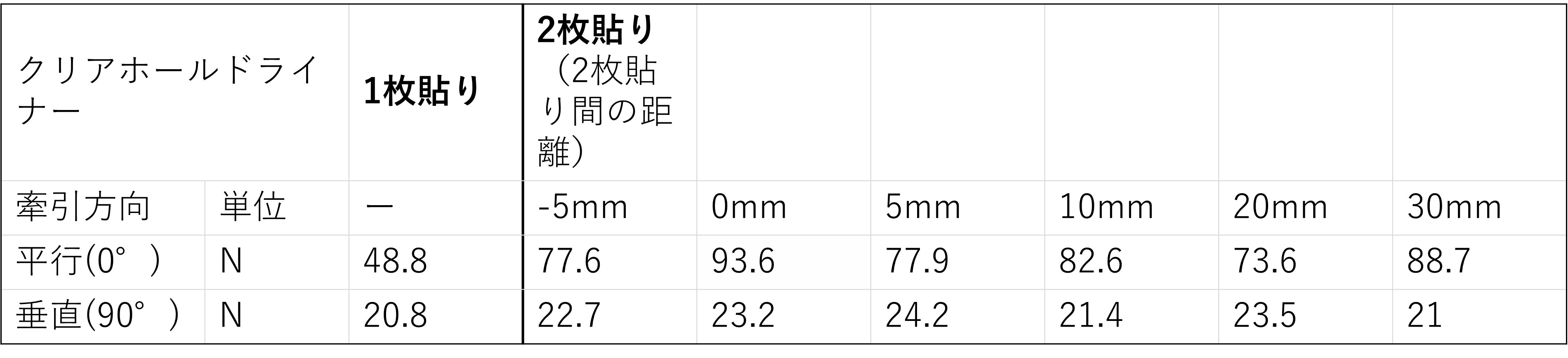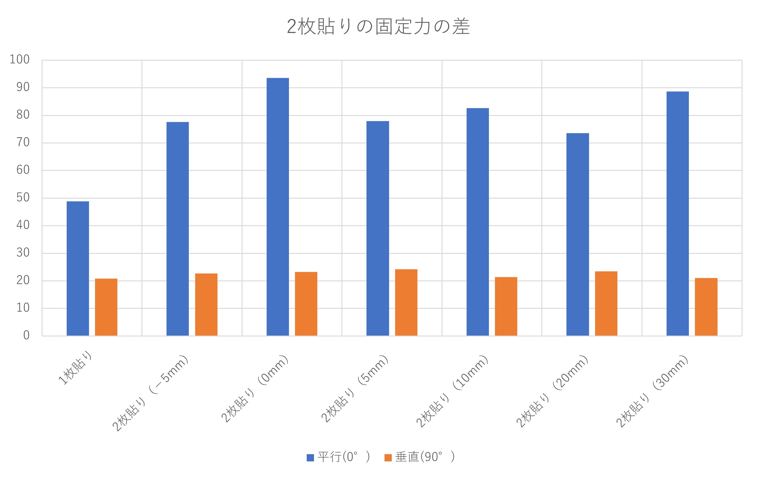 平行方向では、2枚貼りは1枚貼りより固定力が高いという結果がわかりました。