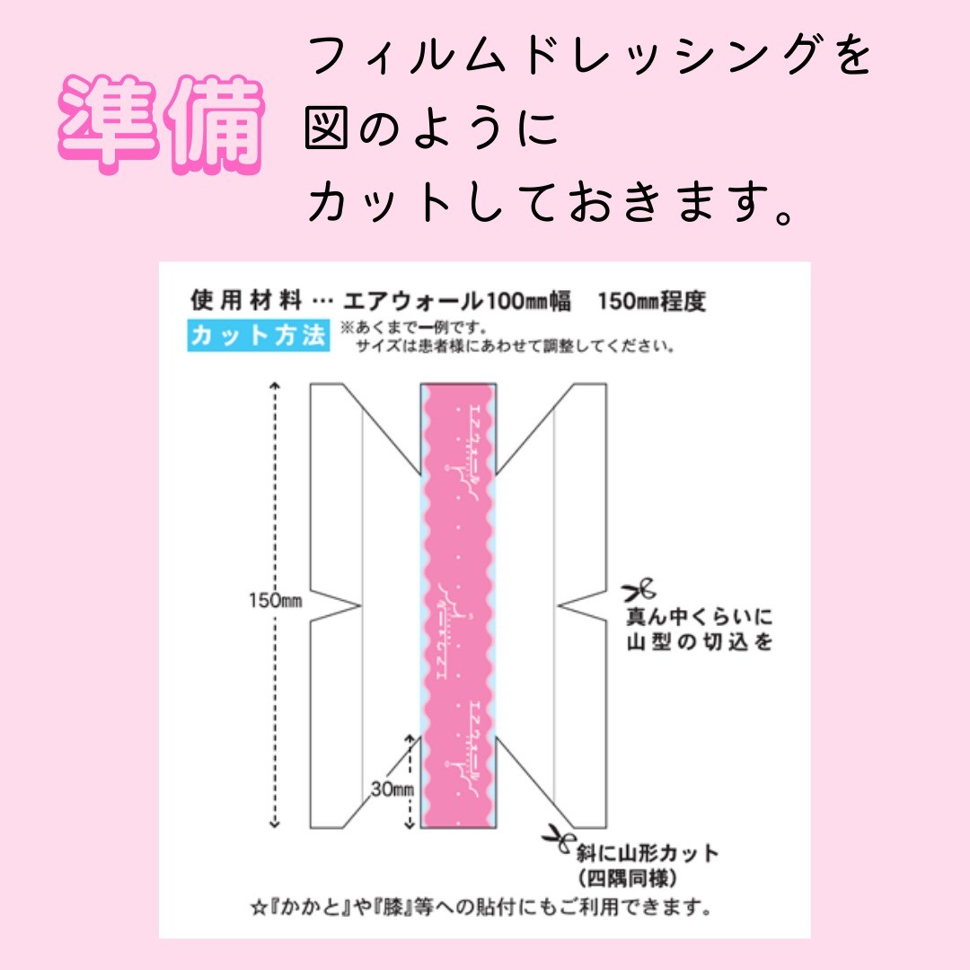 肘や膝にフィルムドレッシングを貼るときは、ちょっとしたコツを押さえておくことで、うまく貼ることができます。