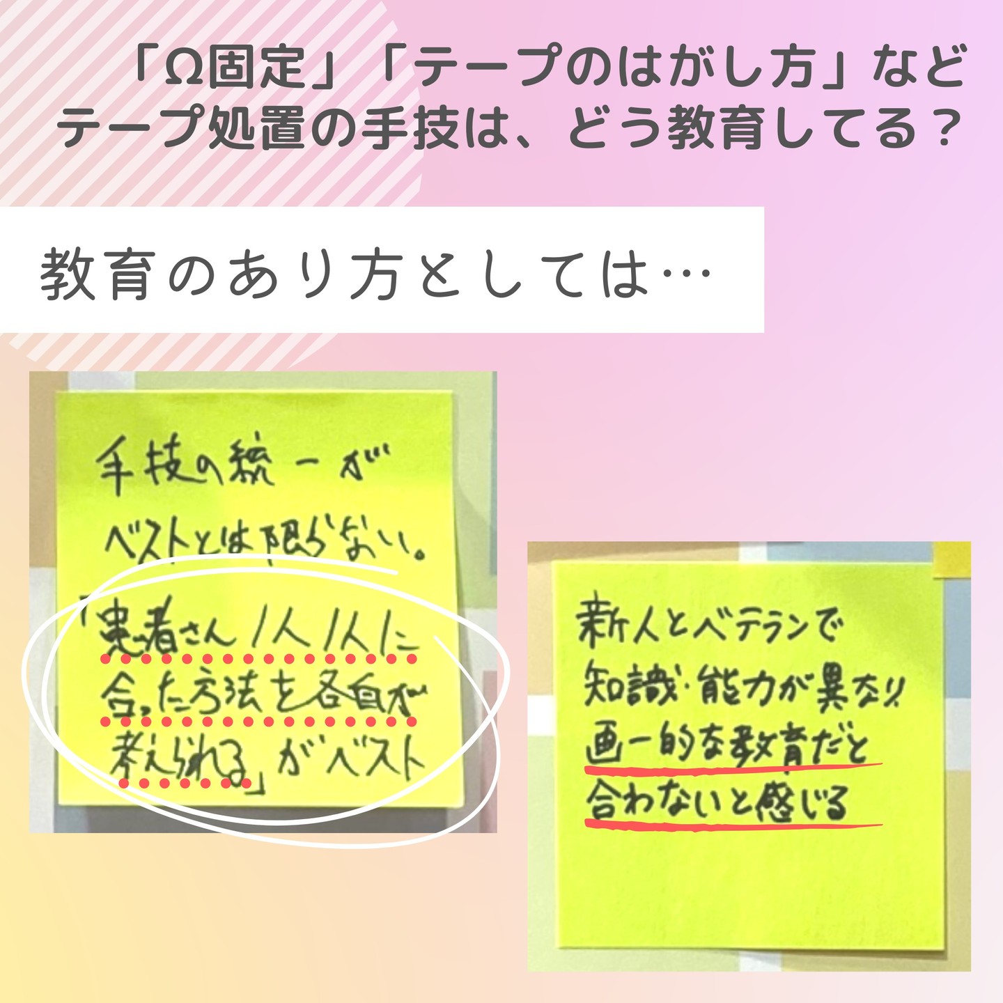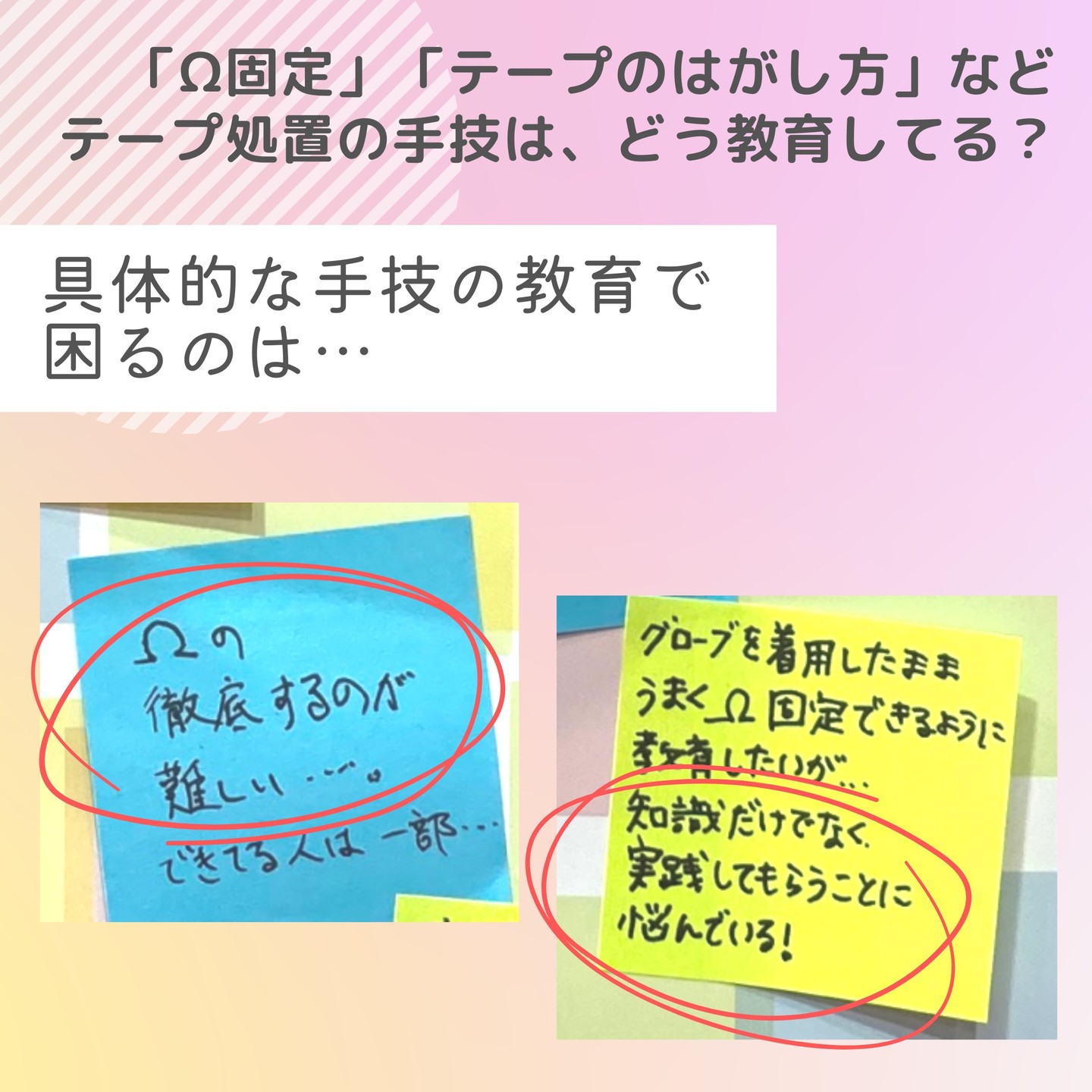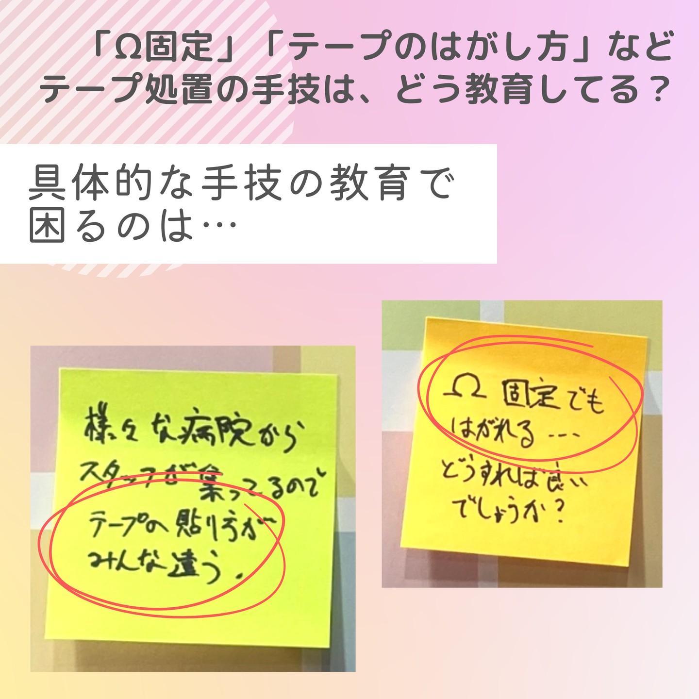 《みんなの意見が集まりました!》Ω固定やテープのはがし方など、テープ処置の手技はどう教育してる?
