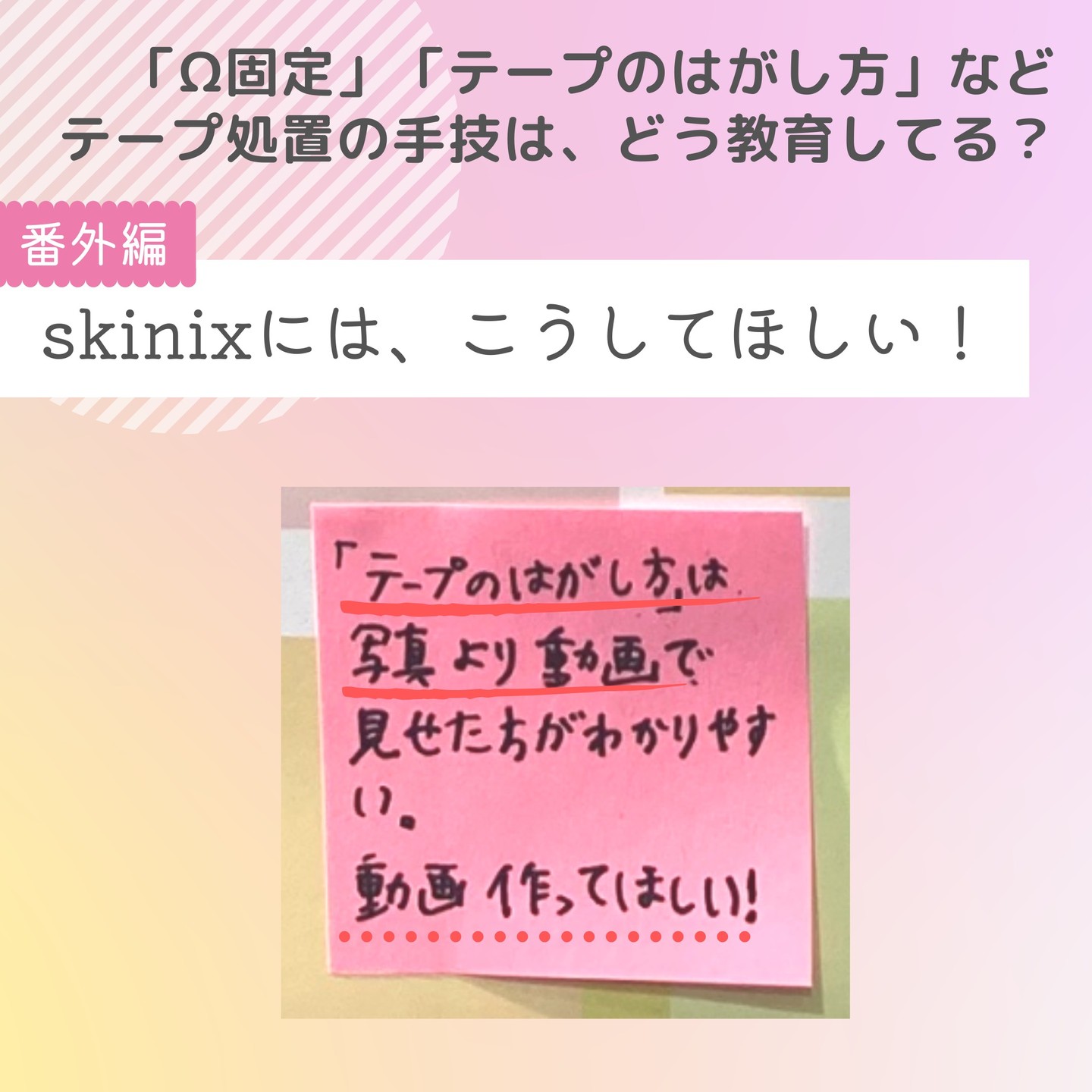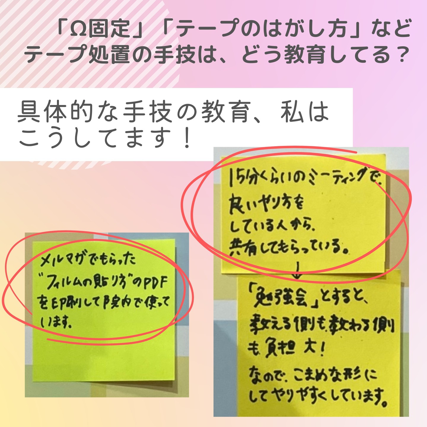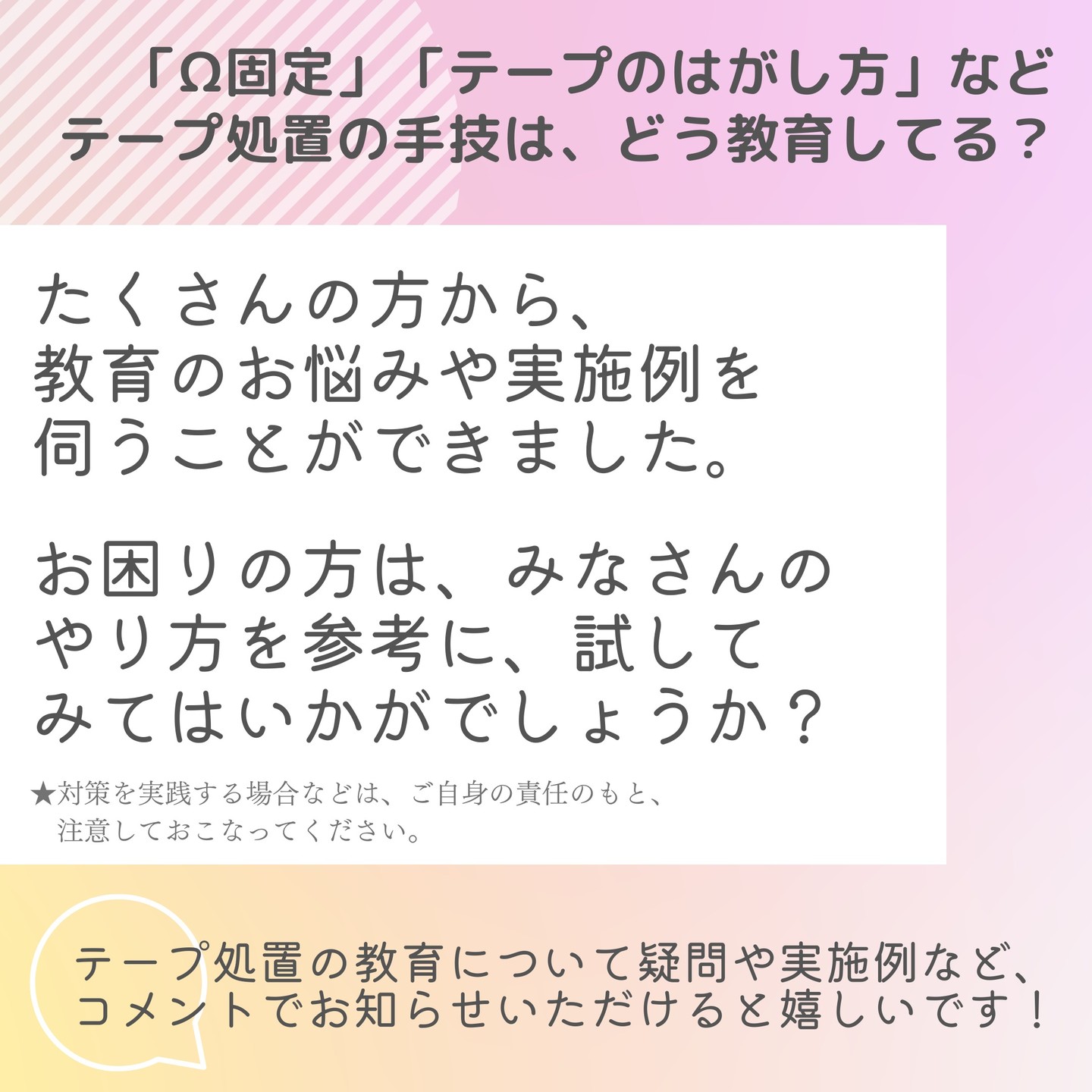 《みんなの意見が集まりました!》Ω固定やテープのはがし方など、テープ処置の手技はどう教育してる?