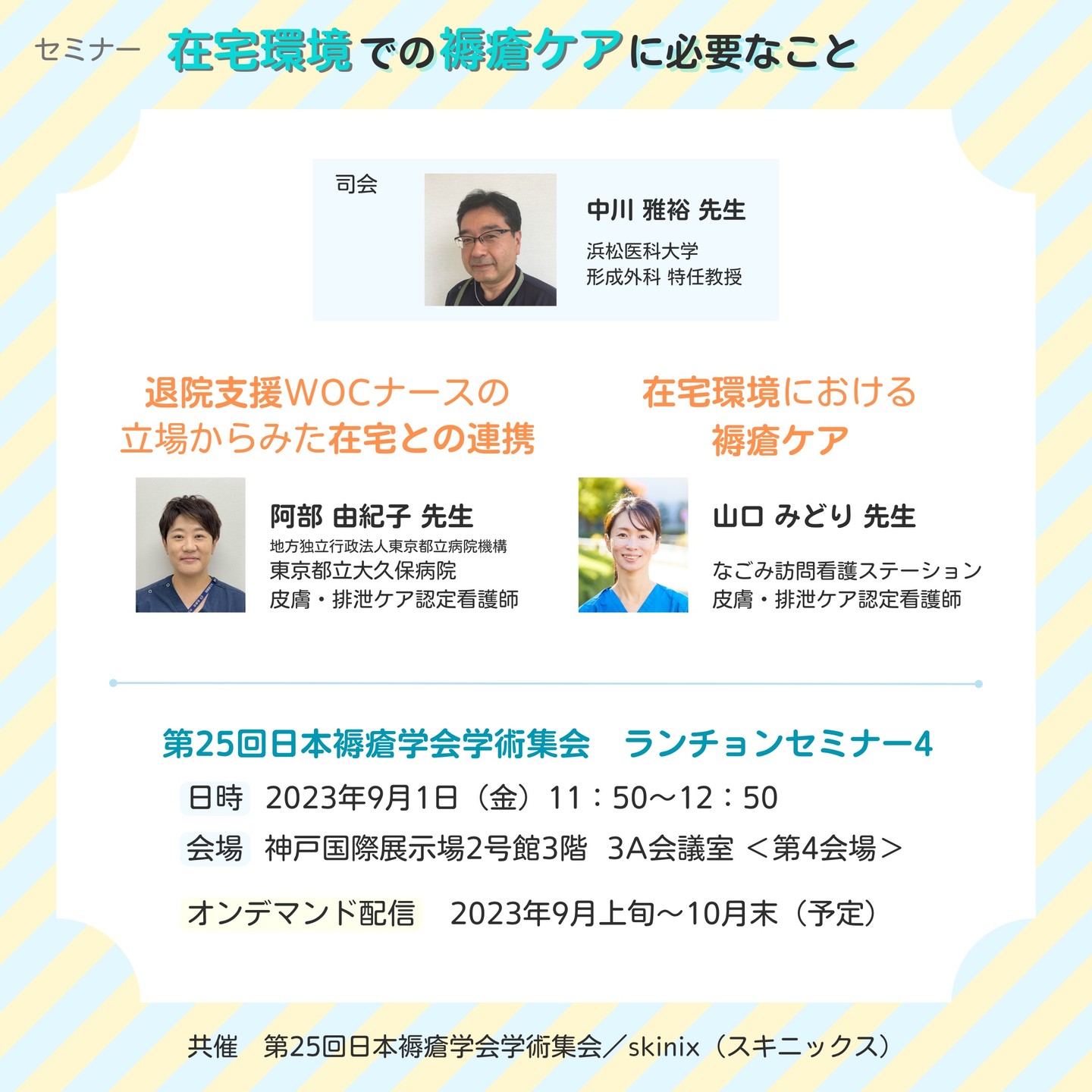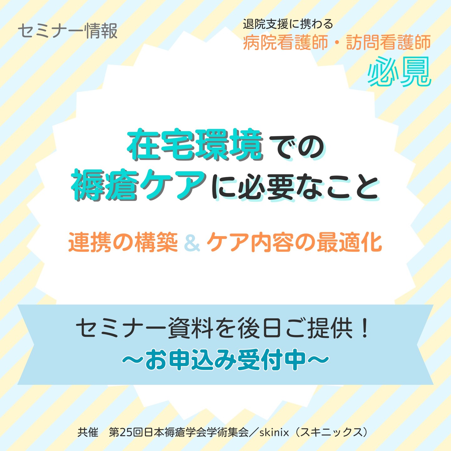 2023年9月1日(金)に神戸コンベンションセンターで行われる第25回日本褥瘡学会学術集会で、ランチョンセミナー「在宅環境での褥瘡ケアに必要なこと~連携の構築&ケア内容の最適化~」をskinixが共催します。