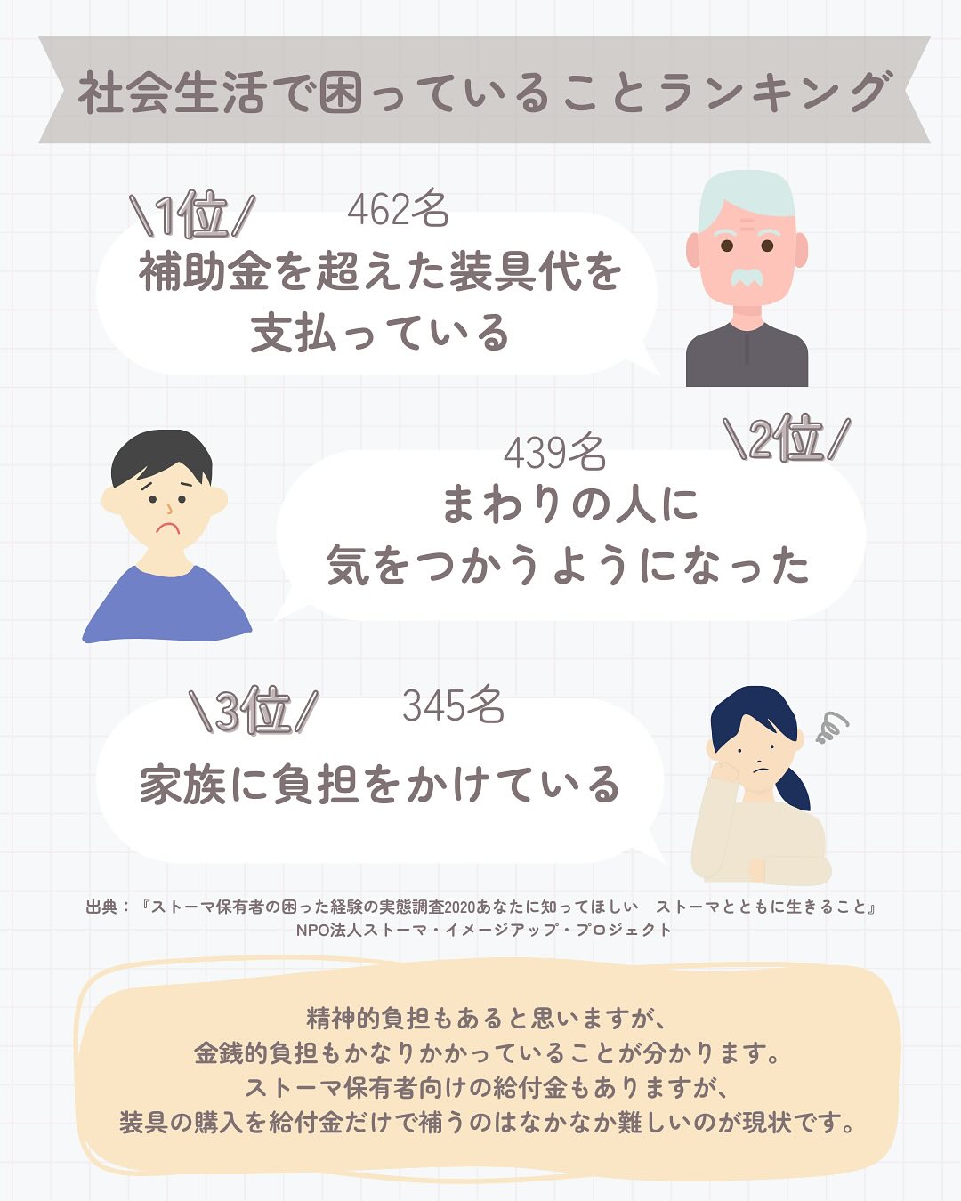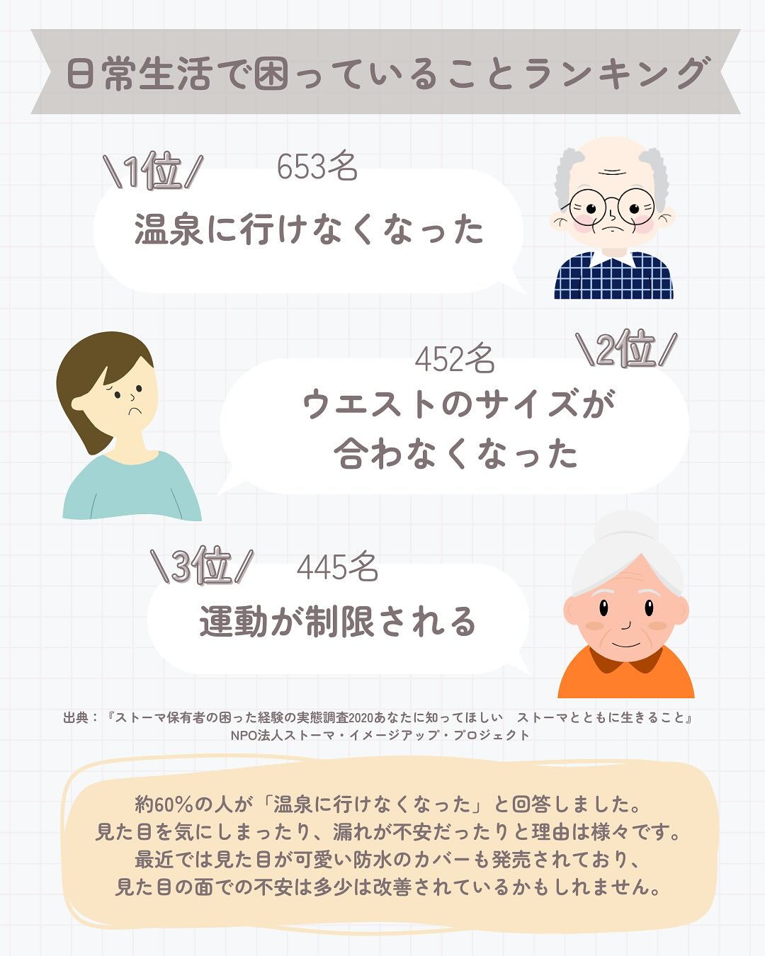(出典:『ストーマ保有者の困った経験の実態調査2020あなたに知ってほしいストーマとともに生きること』NPO法人ストーマ・イメージアップ・プロジェクト)