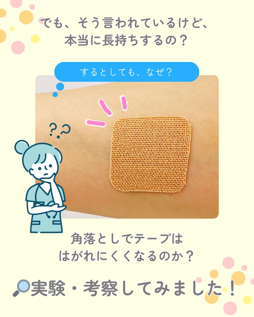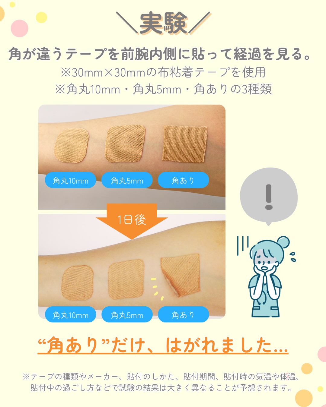前腕内側にそれぞれ“角あり”と“角なし”のテープを貼り、一日経過した様子を比較する実験をしてみました🔎