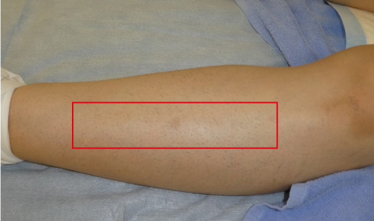 BMIは20台だが脛骨の軽度突出あり。手術中から術後離床できるまで弾性ストッキングを着用。